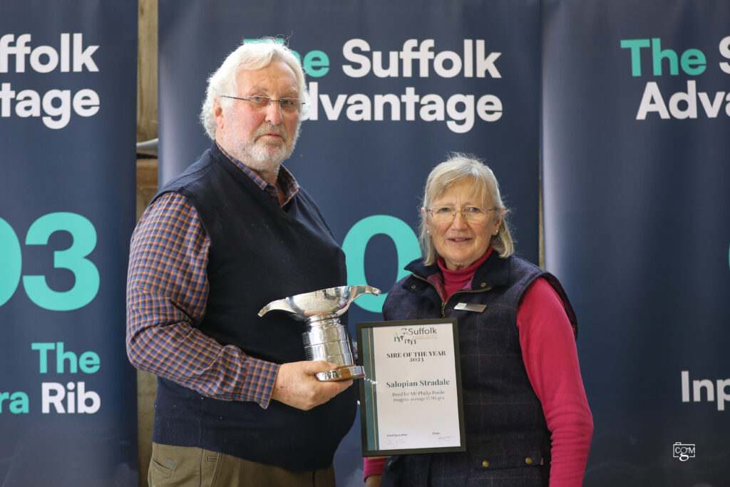 Mr. Phil Poole of the Salopian Flock was invited to the presentation area to belatedly receive the 2023 Sire of the Year Trophy for Salopian Stradale, whose three progeny averaged 17,783gns.